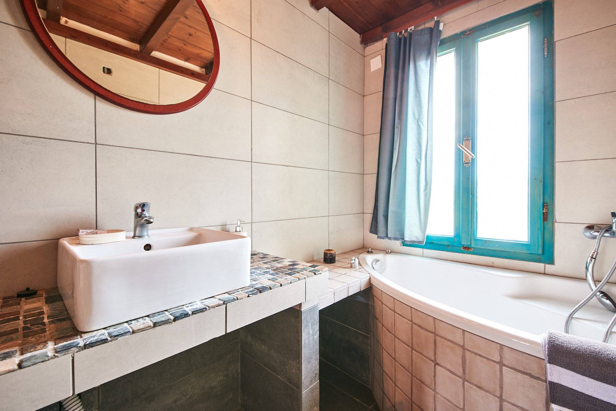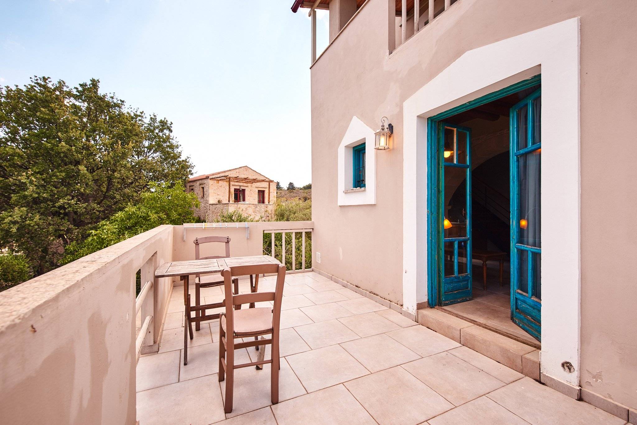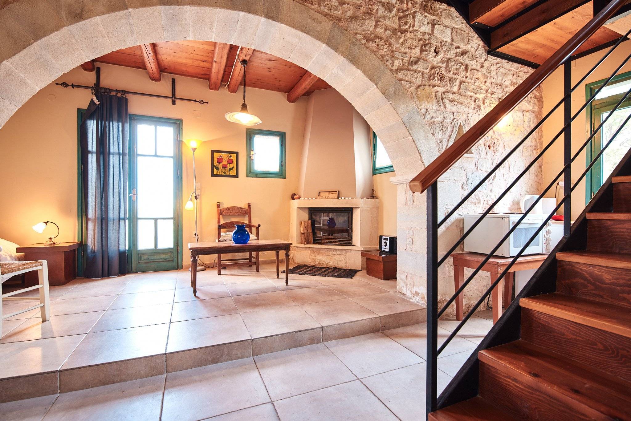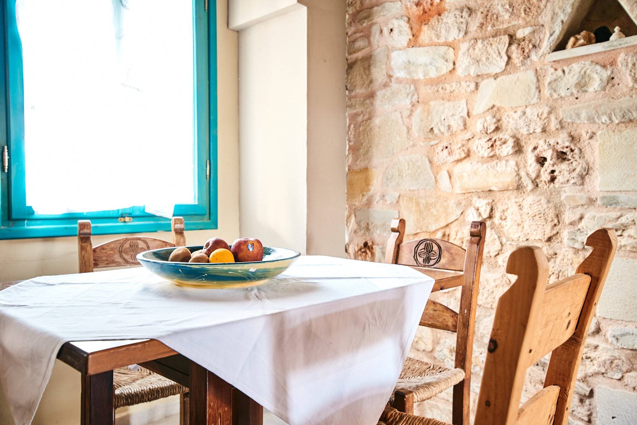 “Elia” guesthouse provides a relaxing and welcoming atmosphere. It has a unique architectural character which is inspired by tradition combining it with modern comfort. On the ground floor you will find the spacious living room with a fireplace and a beautiful arch. There is also one single bed, a fully equipped kitchenette and a bathroom with shower. Upstairs you will find the master bedroom with two single beds and a private bathroom with a bathtub. The two private balconies offer view of the sunset and the olive grove. Mini fridge, TV, air conditioning, free WiFi, toiletries and bedding are included.